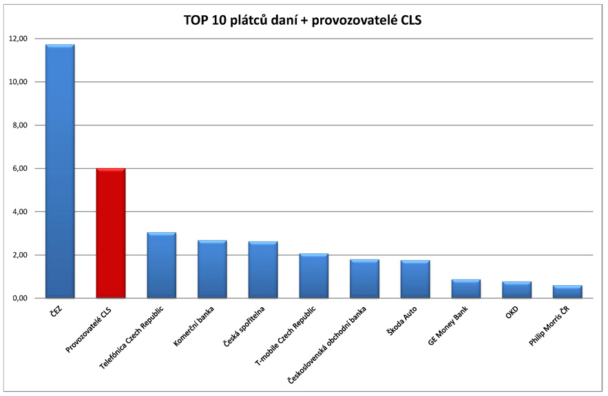 Graf znázorňuje porovnání daně z příjmu právnických osob za rok 2010 u jednotlivých společností a odhad odvodu loterní daně provozovatelů centrálních loterních systémů za rok 2012. Údaje jsou v miliardách Kč.